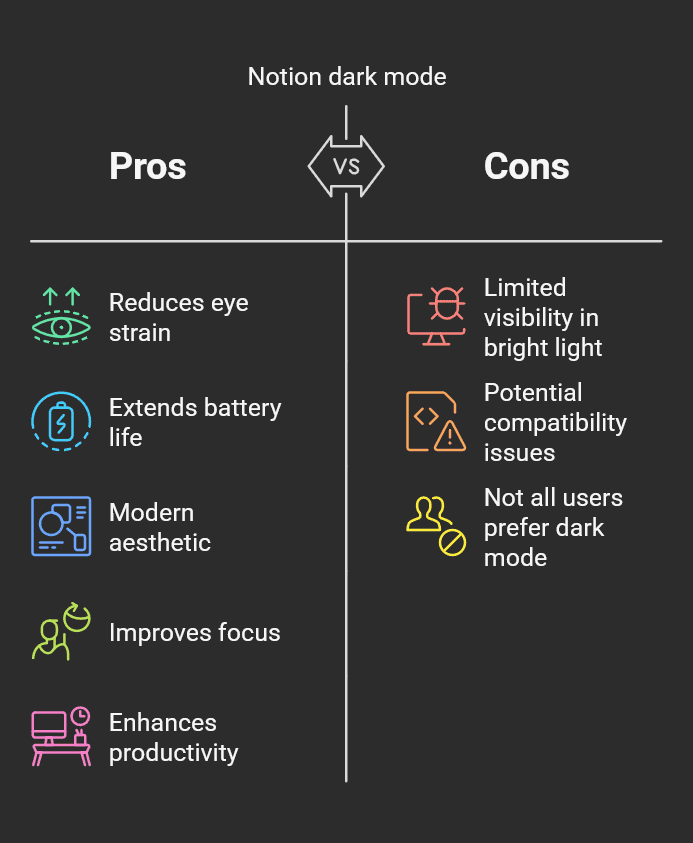 Embracing Notion dark mode can be a game-changer for both your productivity and device longevity. Whether for health, battery savings, or personal style, it’s a worthwhile switch.