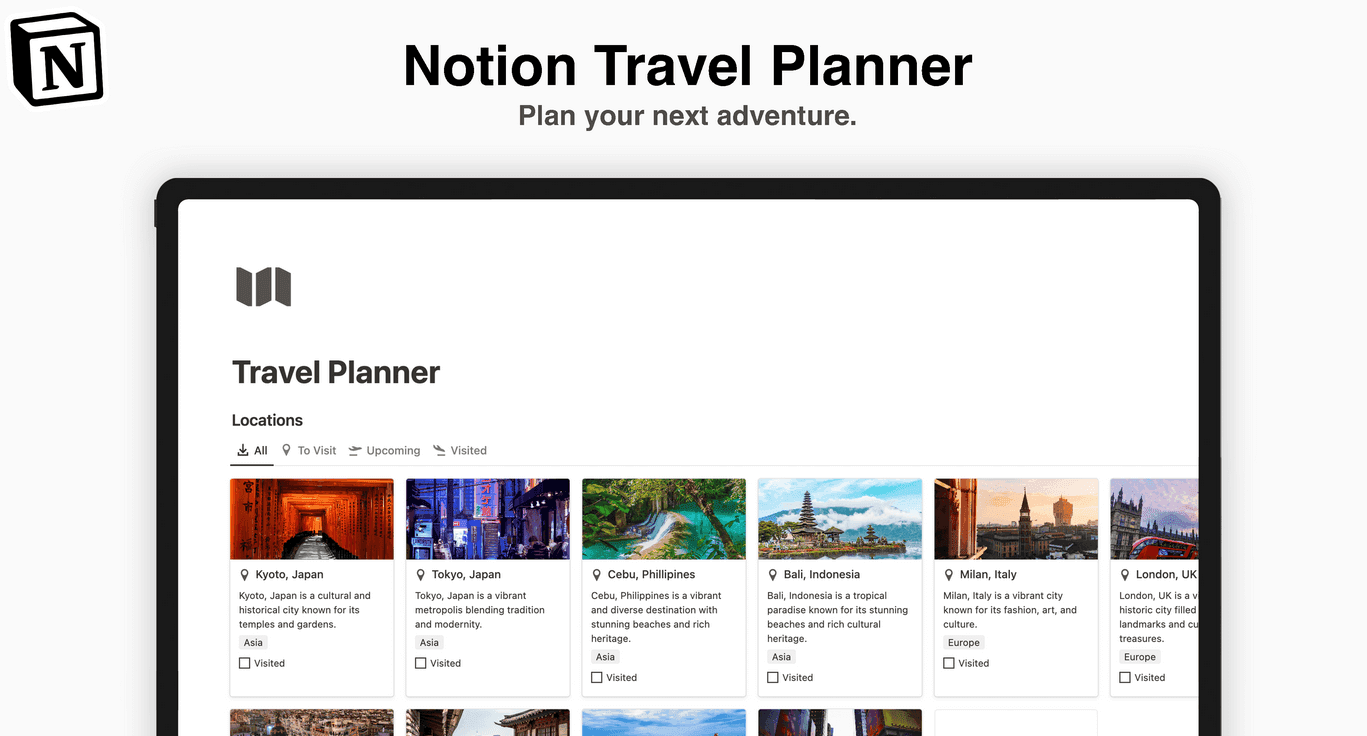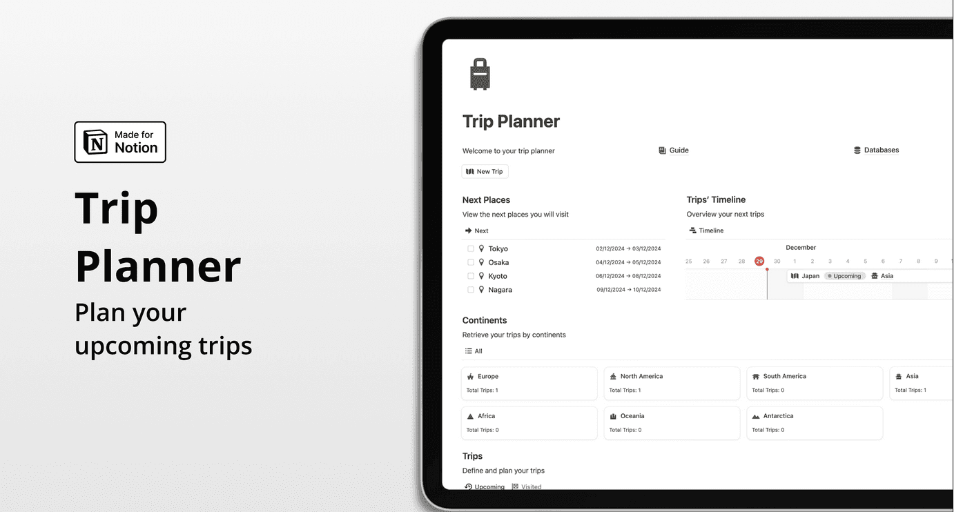 Perfectly plan your upcoming trips with the Trip Planner Notion template. Do you find it challenging to plan your upcoming trips and create a well-defined itinerary? The Trip Planner is what you are looking for! Use this template to effectively plan your trips and embark on your travels with peace of mind.