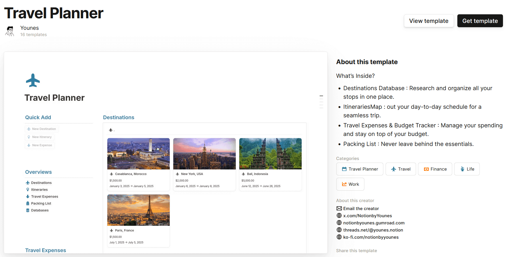 Travel Planner by Younes – A well-structured Notion template to organize your itinerary, complete with map, budget, and travel checklist and to-do, ensuring a smooth and stress-free trip.