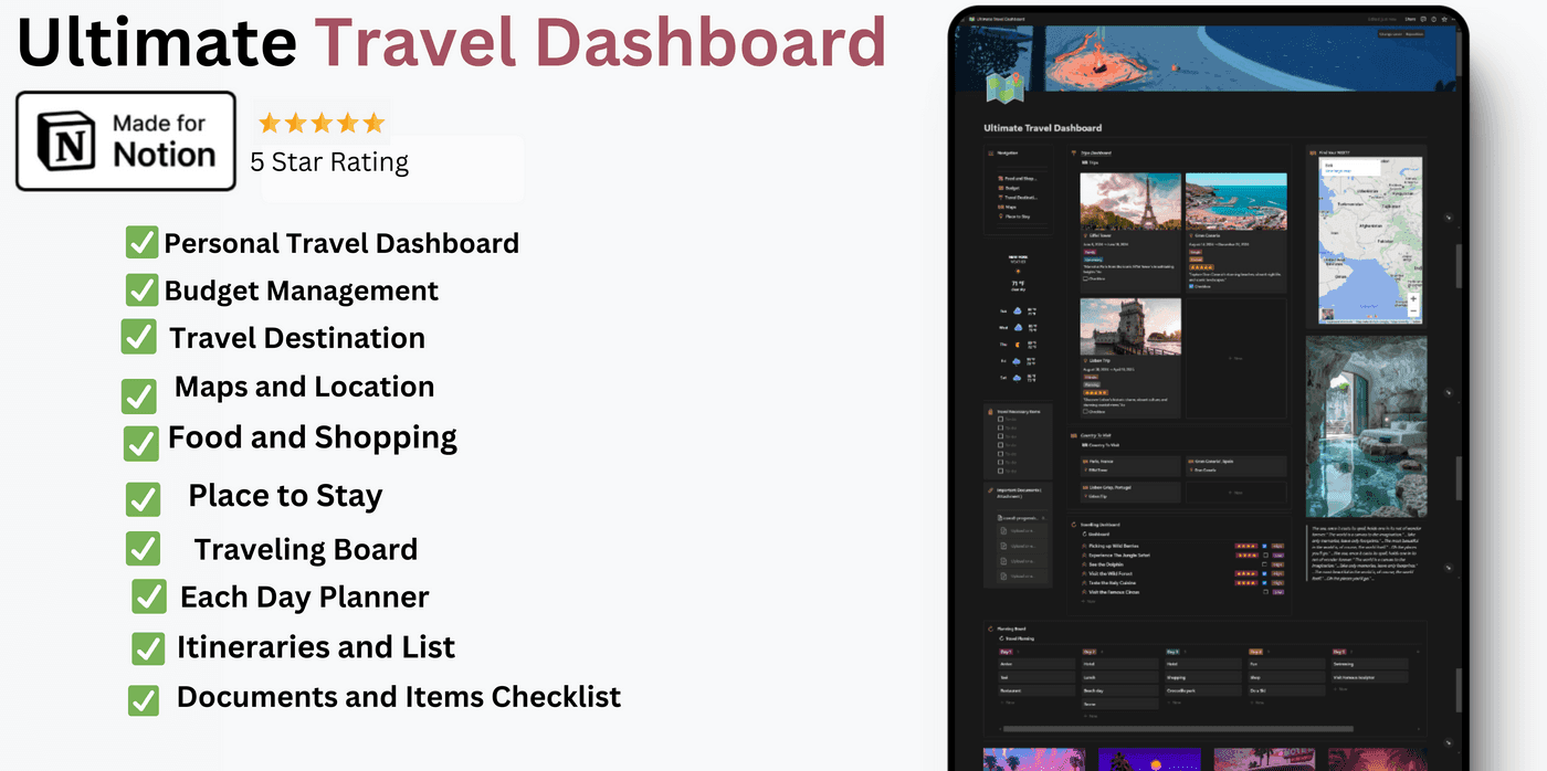 Notion Travel Planner is designed to simplify your travel experience. It features itinerary building to structure your journey, a travel timeline for scheduling activities, and a comprehensive packing list to ensure you have everything you need for your adventures.