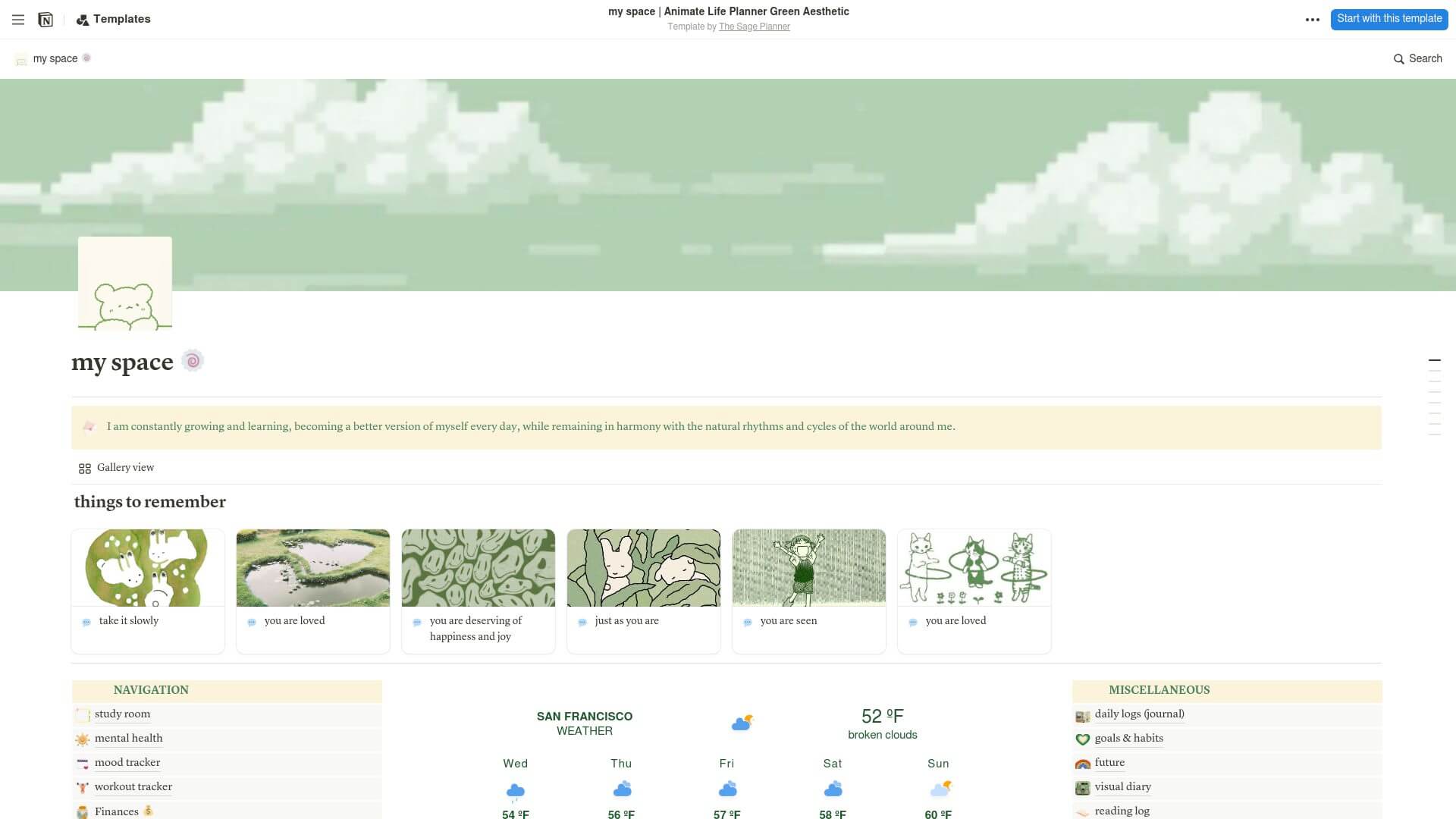 With its intuitive design, the Animate Life Planner helps manage personal and professional goals. It offers task scheduling and note customization in a refreshing green aesthetic. This template is perfect for those who want to cultivate a lively and organized digital space. It's a shining example of how free notion templates can enhance both productivity and style.