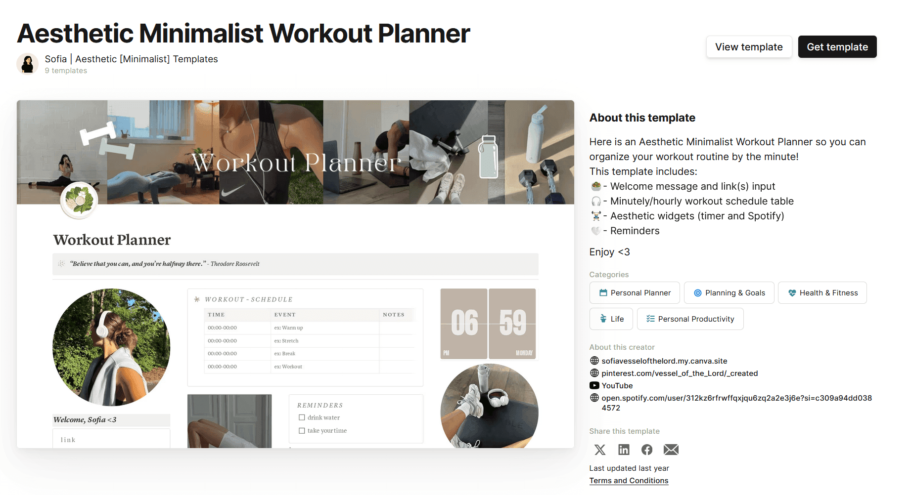 The Aesthetic Minimalist Workout Planner is a beautifully designed free Notion template that helps you track your fitness journey with ease. With a clean and minimal layout, it allows you to organize workouts, set goals, and monitor progress—all in a visually appealing dashboard.