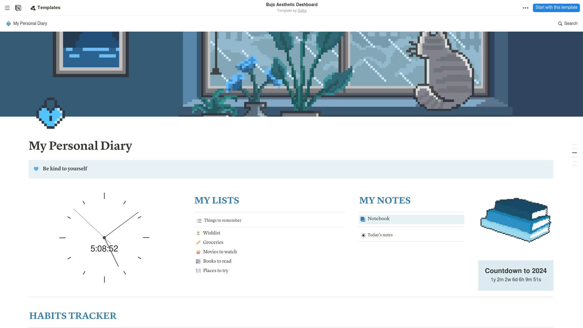 The Bujo Aesthetic Dashboard offers customizable features for note-taking, mood tracking, and task management in a bullet journal style. Perfect for fans of journaling, this template brings the charm of Bujo into the digital world. It's an ideal choice for those who appreciate the art of organization, proving that free notion templates can be both creative and structured.