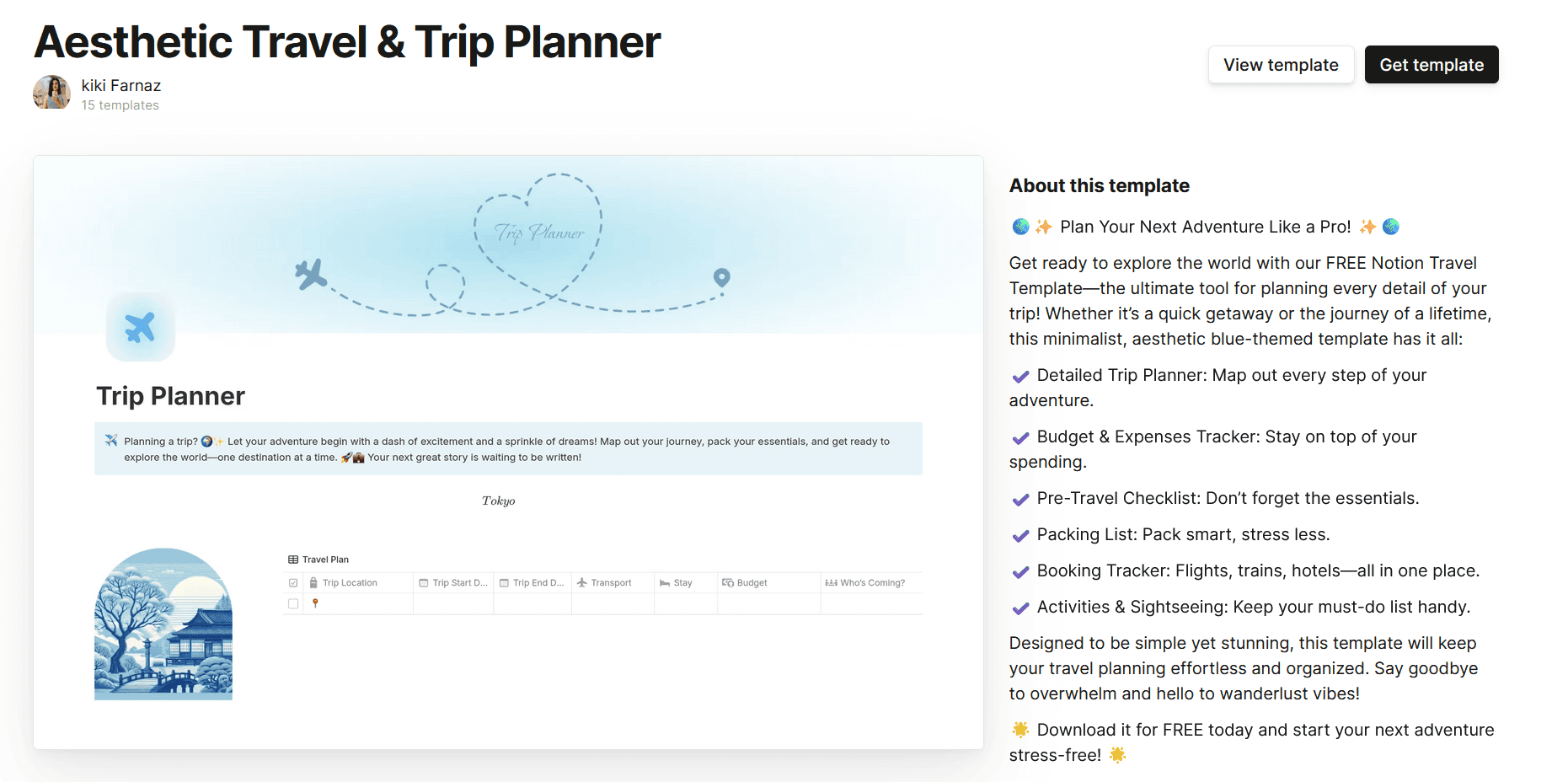 The Aesthetic Travel Trip Planner is a beautifully designed free Notion template that helps you organize your trips effortlessly. With sections for itineraries, packing lists, budgets, and travel notes, this template ensures a stress-free and visually appealing travel planning experience.