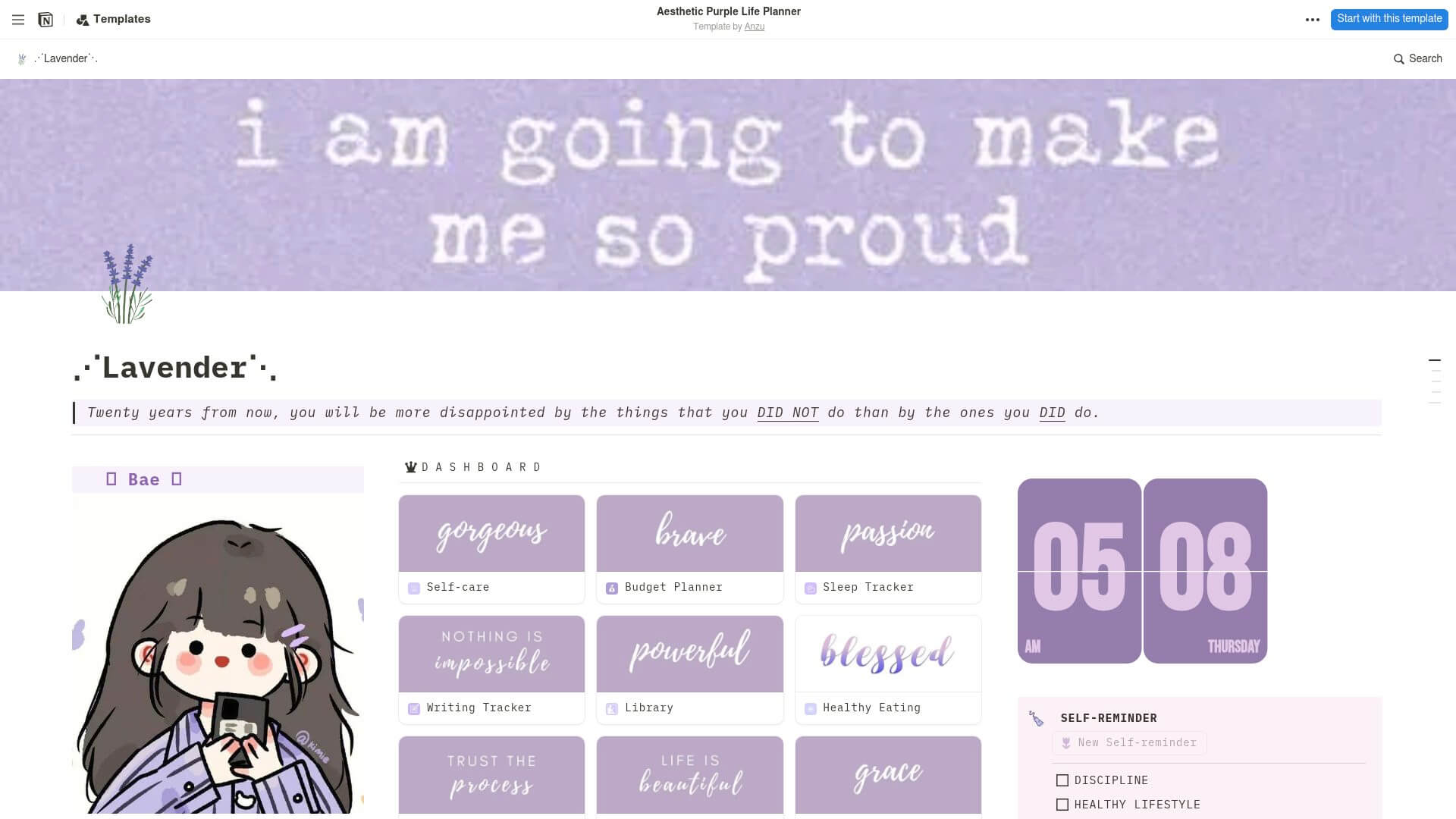 Indulge in the visually stunning Aesthetic Purple Notion Life Planner. This template includes habit trackers and self-care routines, all presented in a beautiful purple theme. It's designed for those who wish to manage their life holistically while enjoying a touch of elegance. With this template, "notion templates" means more than just utility; it means living beautifully.