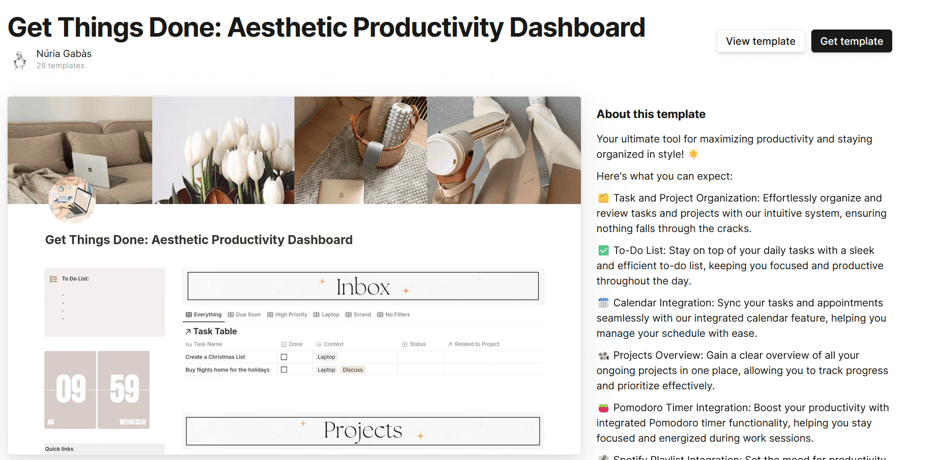 The Get Things Done Aesthetic Productivity Dashboard is a powerful free Notion template designed to help you capture, organize, and prioritize tasks efficiently. Inspired by the GTD method, this template provides a structured system for boosting productivity and staying on top of your commitments.