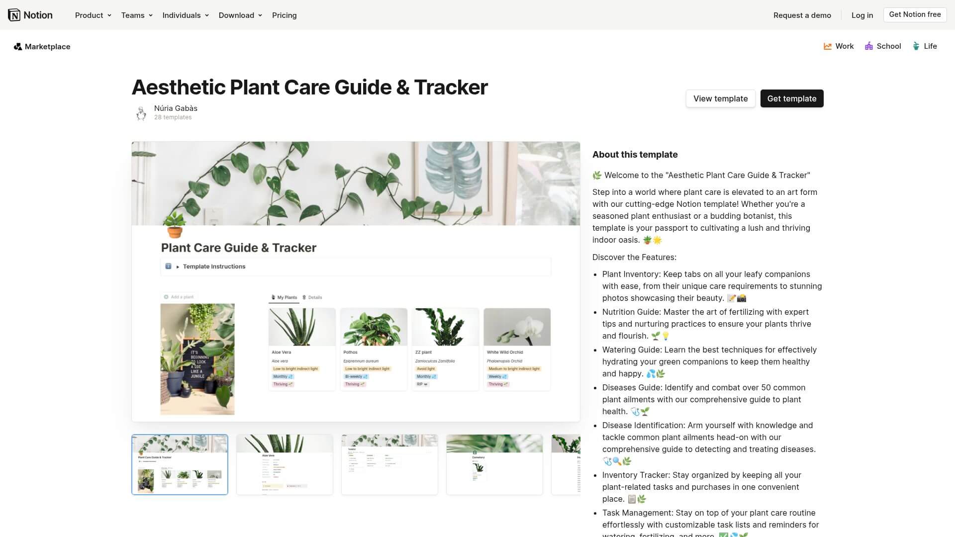 Plant enthusiasts will adore the Aesthetic Plant Care Guide & Tracker. It includes features like inventory management, nutrition and watering guides, and task scheduling to keep your green companions thriving. This template is a perfect example of how "notion templates free" can cater to niche interests while enhancing organizational skills.