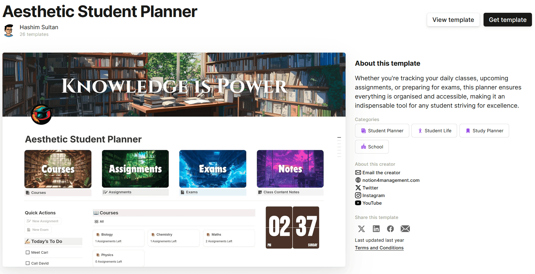 The Notion Academic Organizer combines academic tools with motivational elements to keep you inspired. With features for assignment tracking and course management, this template is ideal for students who want to stay motivated and organized. It's a delightful way to see how notion templates can boost both productivity and morale.