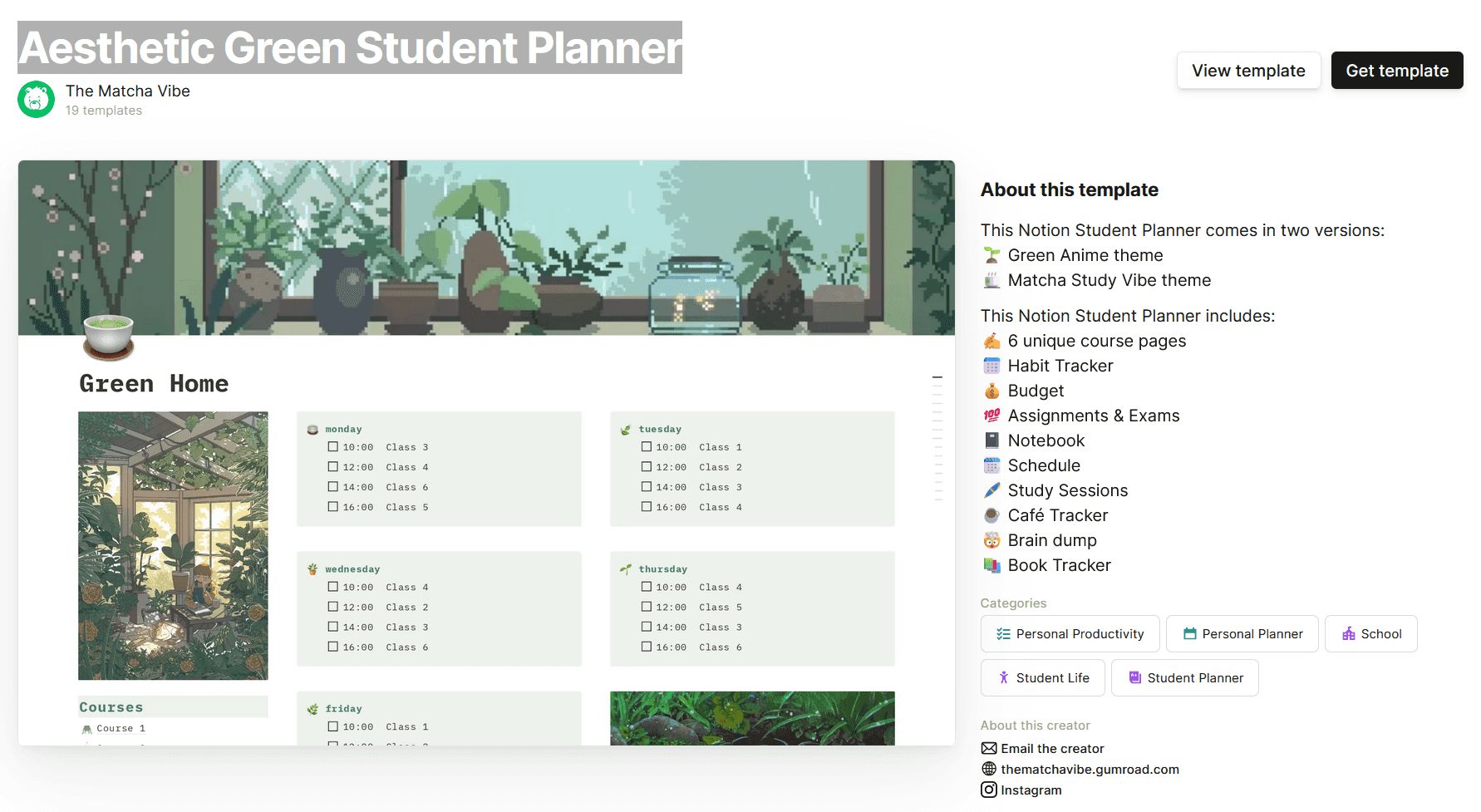 The Aesthetic Green Student Planner is a stylish and functional free Notion template designed to help students stay organized and productive. With a calming green theme, it includes sections for assignments, schedules, and notes, making studying more efficient and visually appealing.